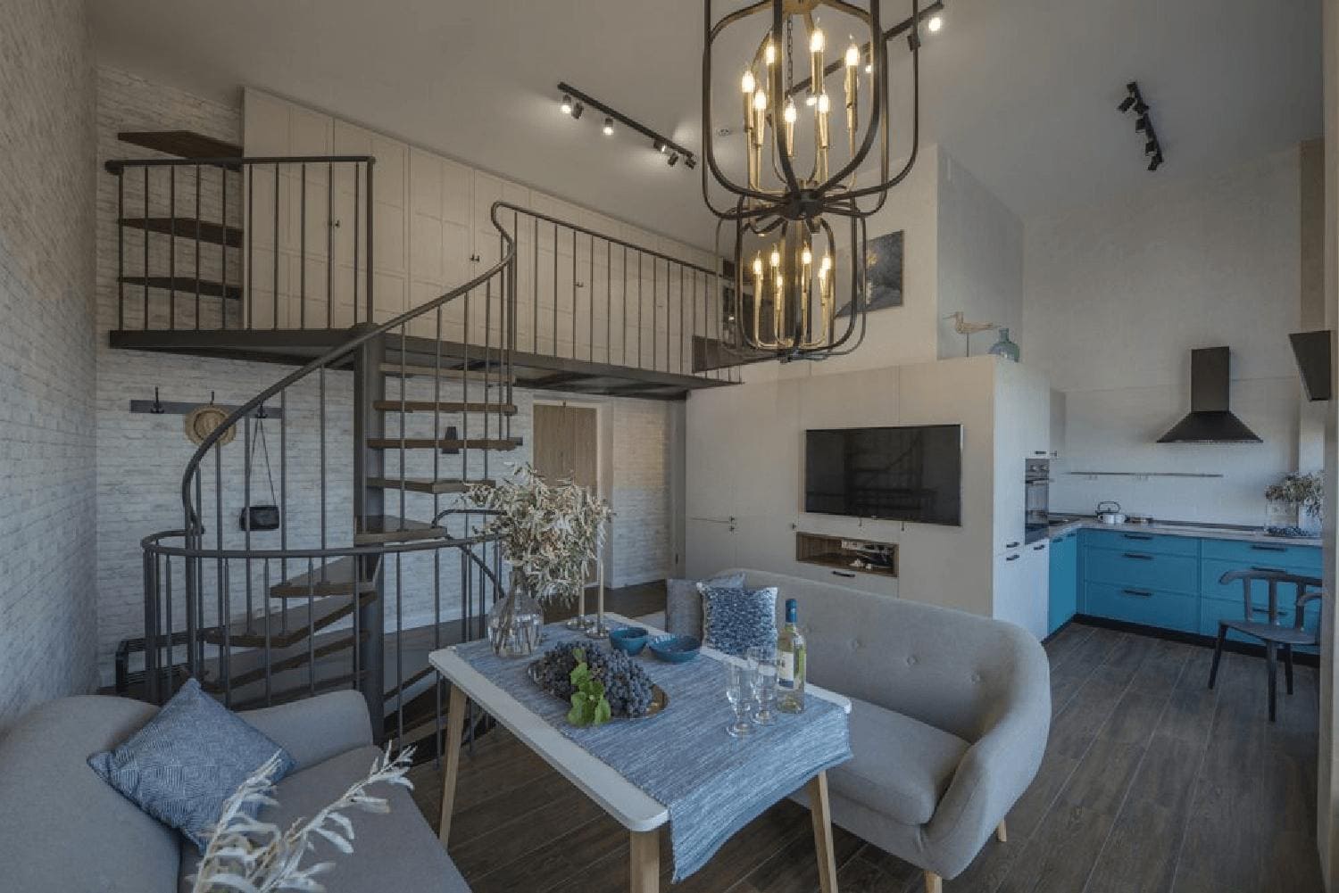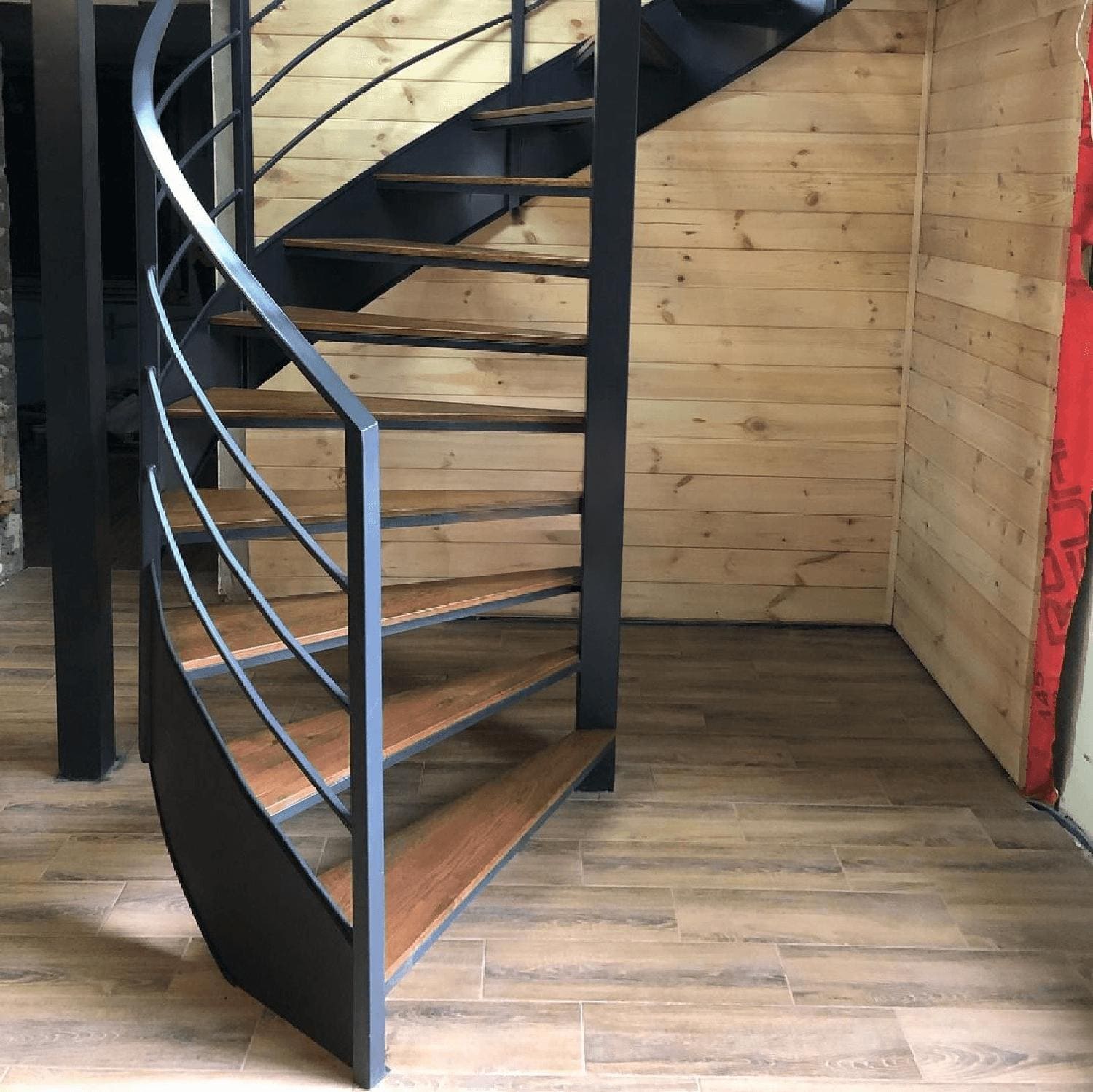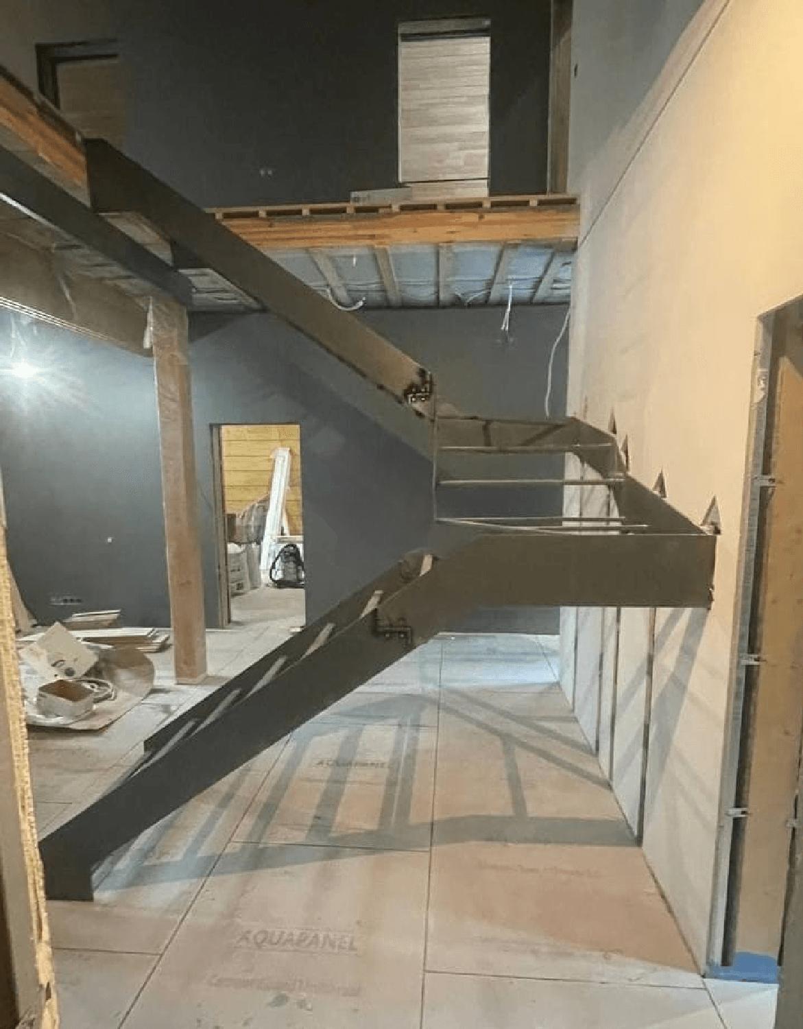 Лестница на металлической тетиве в стиле лофт.